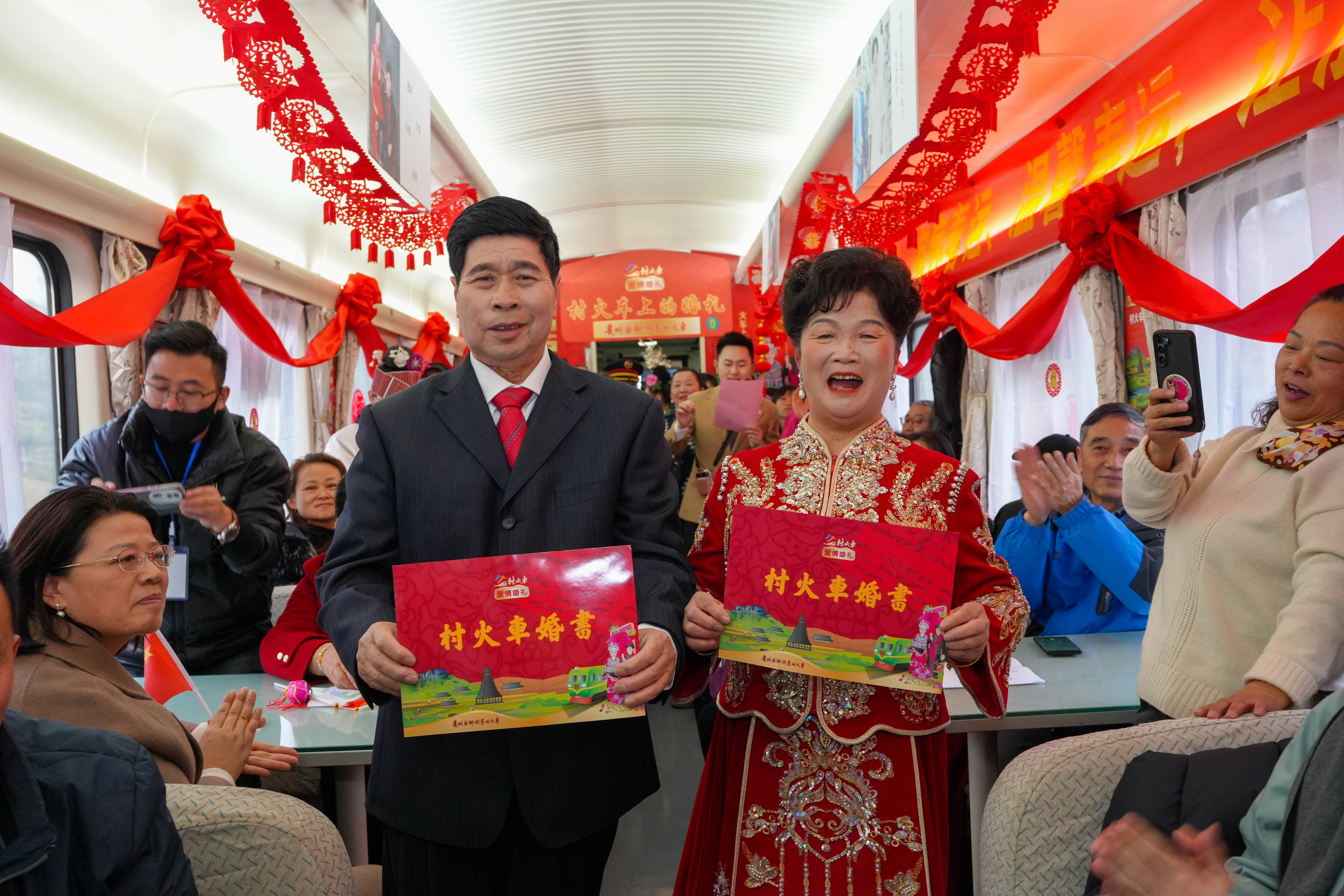 1月18日,一对金婚夫妇在5640次列车上举行“村火车上的婚礼”。新华社发(龙建睿 摄)