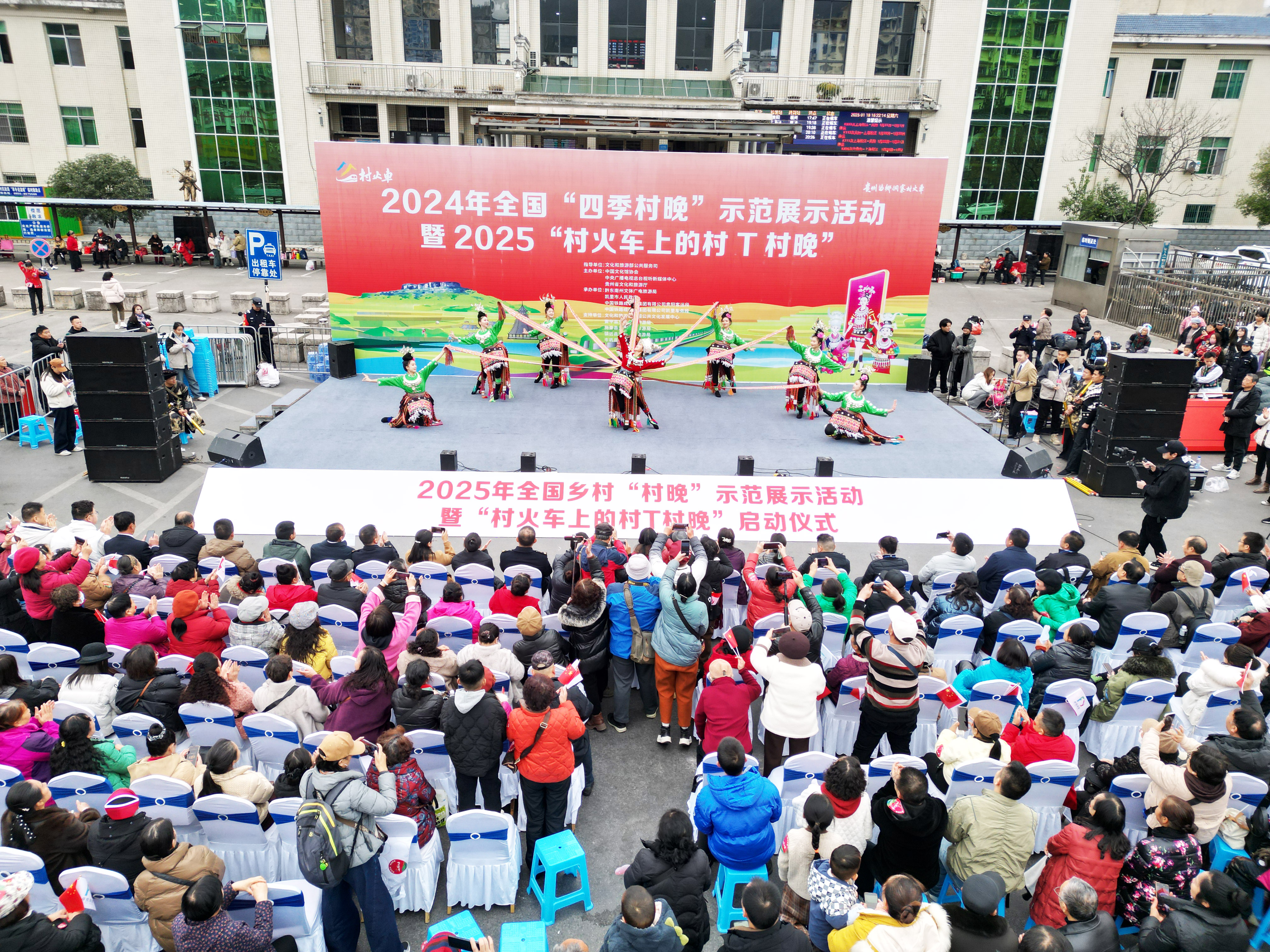 1月18日,在沪昆铁路凯里站,少数民族演员为乘客表演“村晚”节目(无人机照片)。新华社发(余天英 摄)