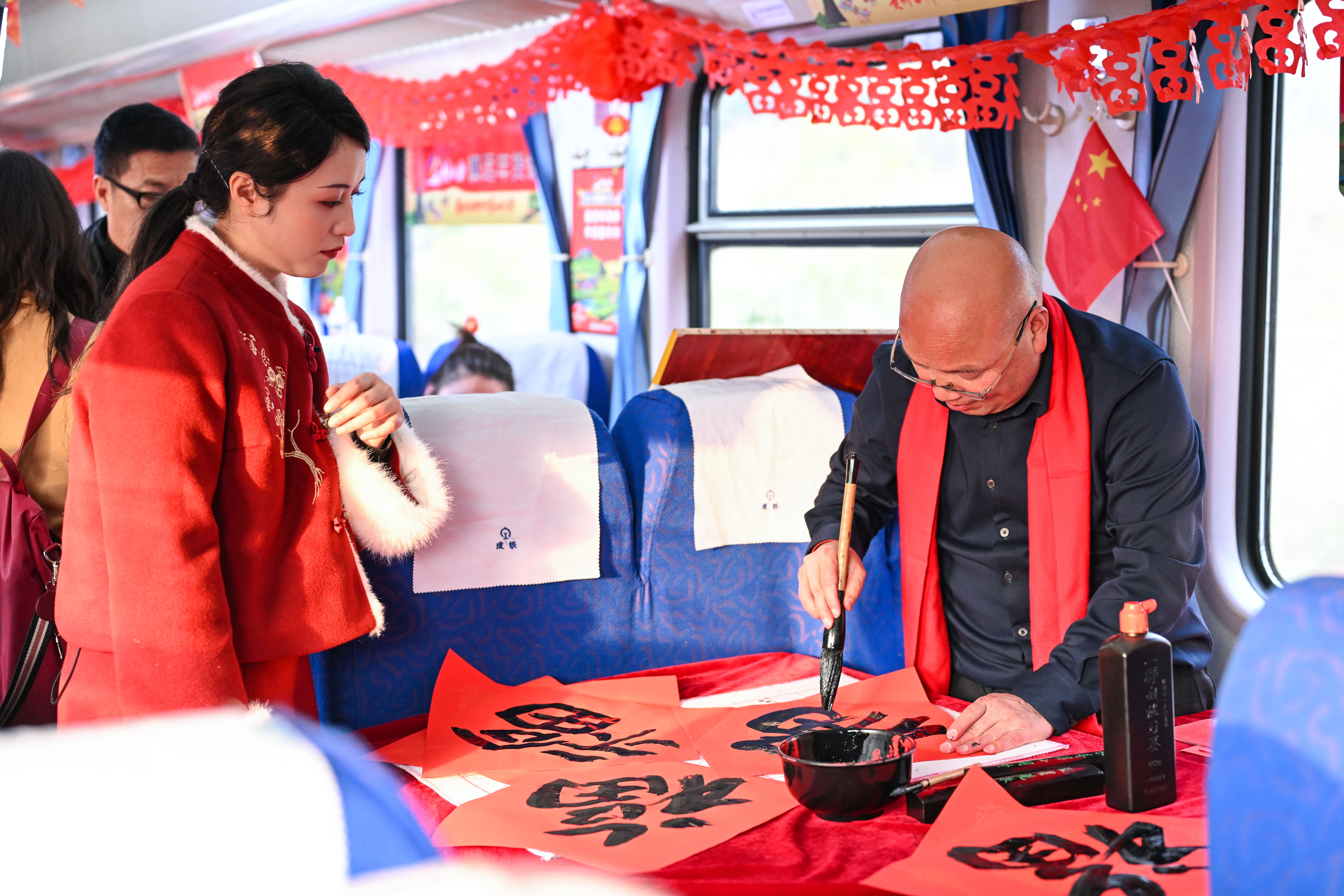 1月18日,书法家在5640次列车上给乘客书写福字。新华社记者 杨文斌 摄