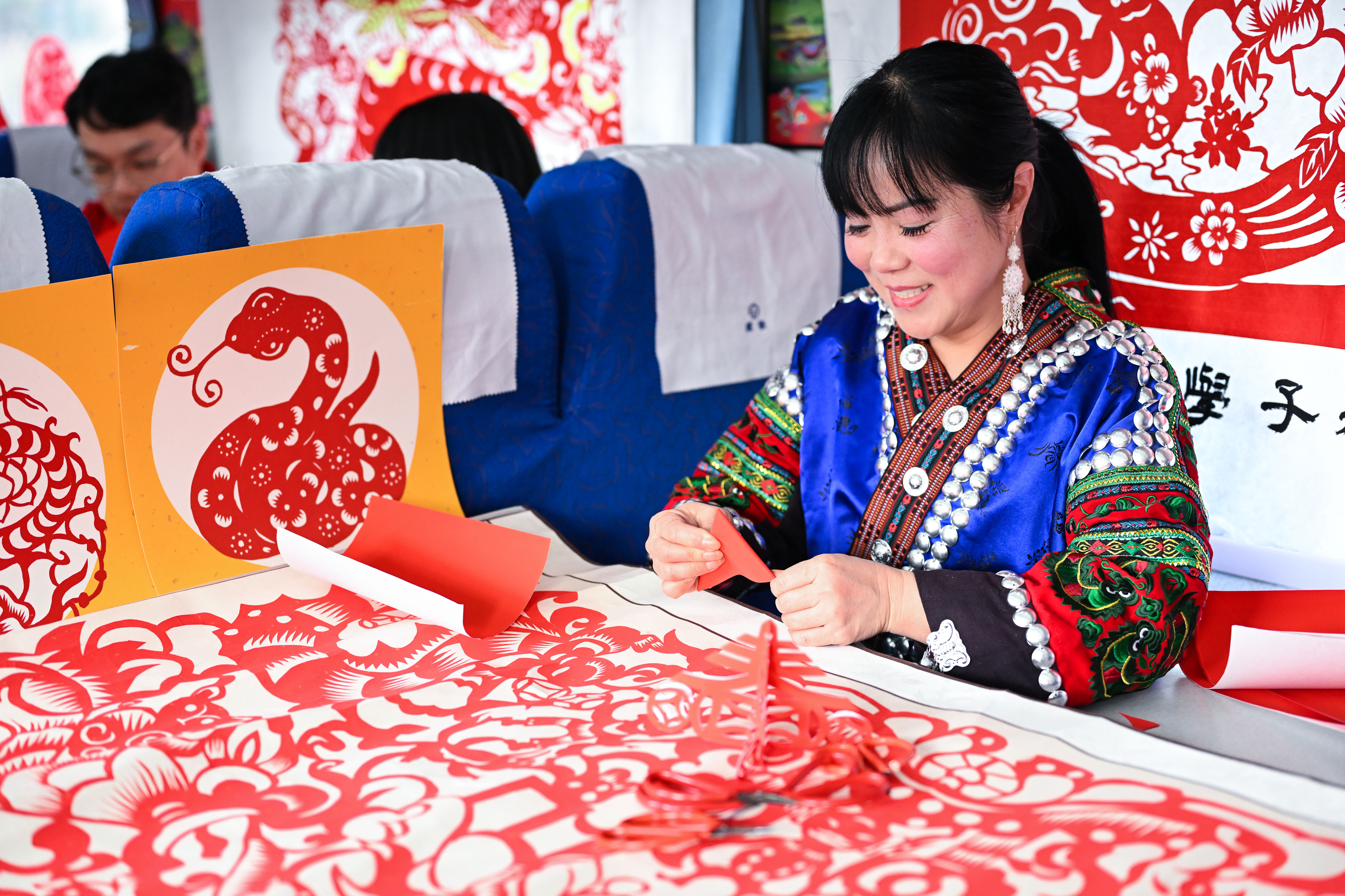 1月18日,非遗传承人在5640次列车上向乘客展示剪纸技艺。新华社记者 杨文斌 摄