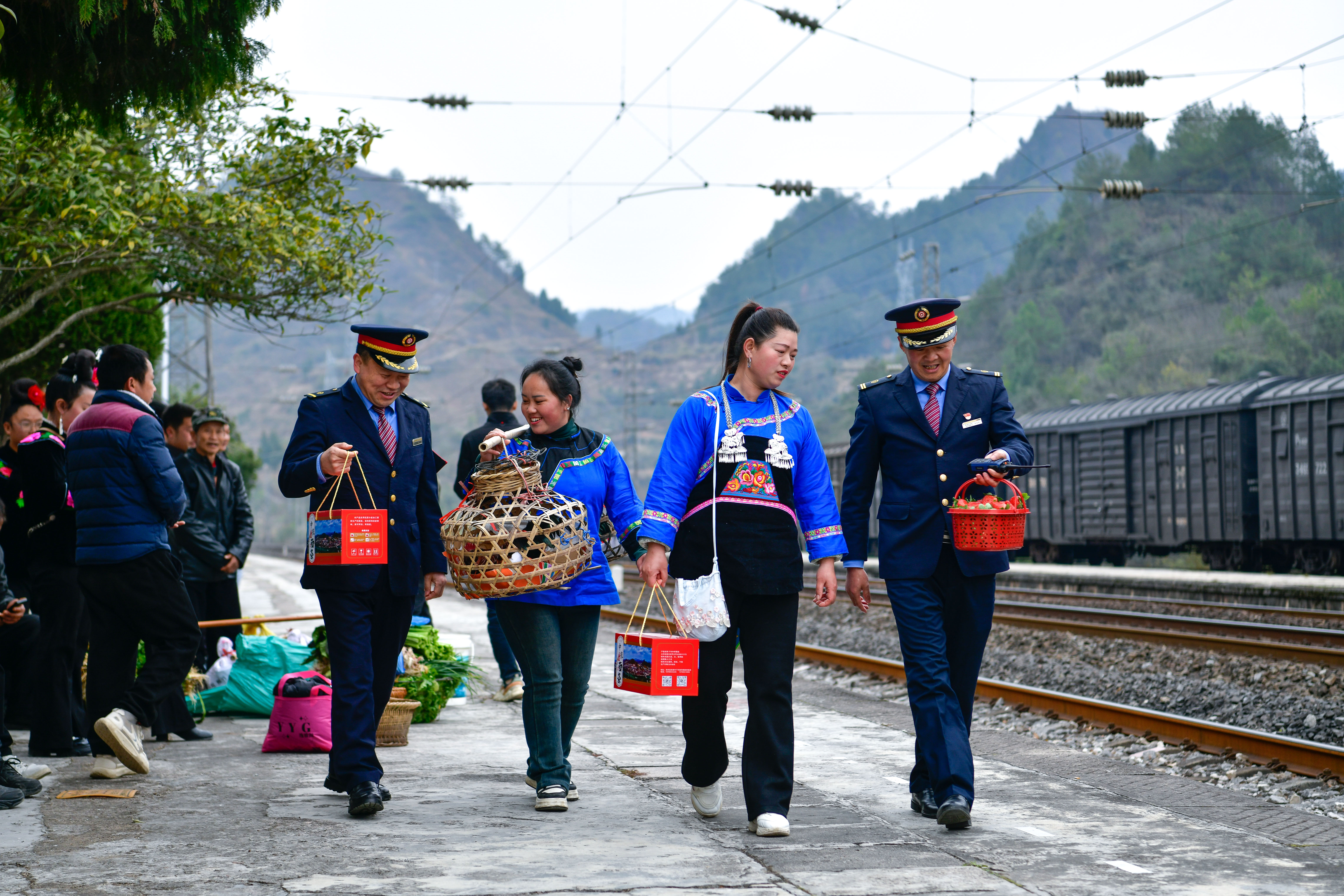 1月18日,在沪昆铁路六个鸡火车站,铁路工作人员与村民交流当天售卖的农产品情况。新华社记者 杨文斌 摄
