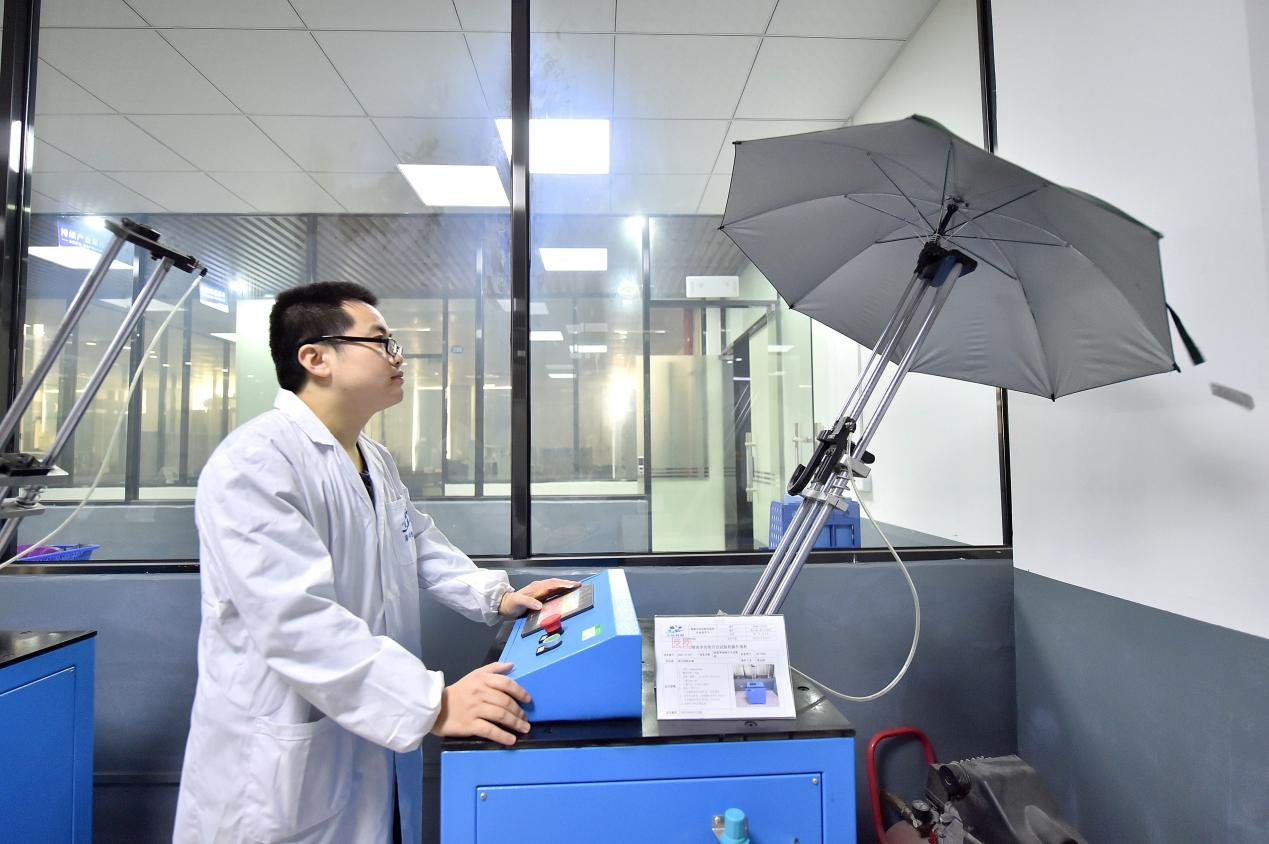 每批次伞具进入市场前,都要经历“魔鬼考验”般的闯关:2分钟的淋雨检测、300次的开合疲劳试验、500次的弹簧测试,还有甲醛、重金属等数个指标的严格检测。
