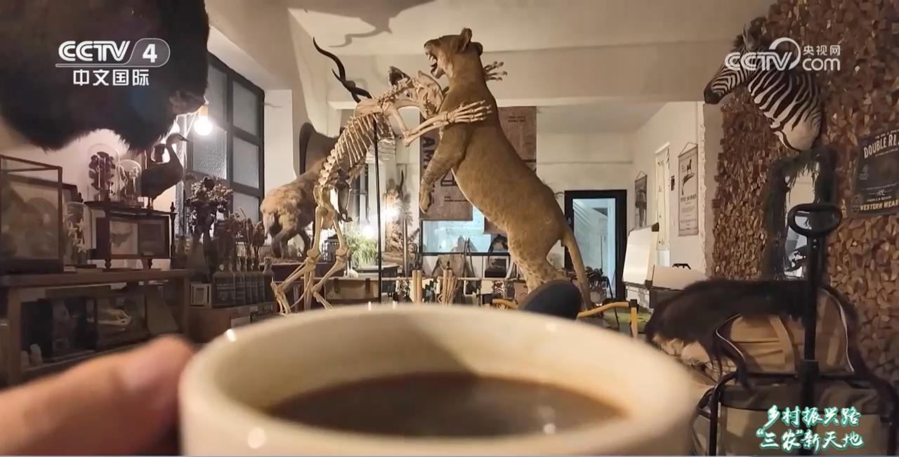 为了在市场中站稳脚跟,从业者不光在产品上创新,在经营理念上也是不断出新。在一个普通小区里,记者竟然发现了一家动物标本主题咖啡店,不少游客专门跑来打卡。