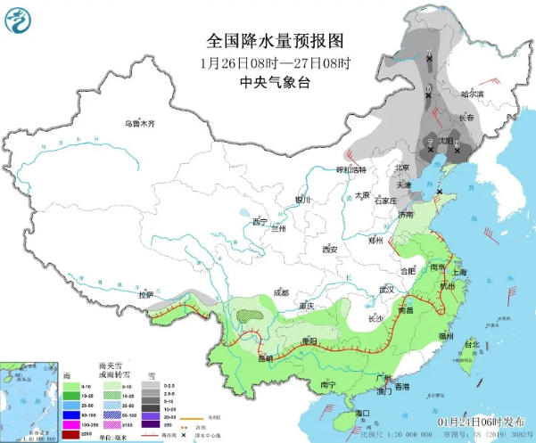 26日,内蒙古东部、黑龙江西部、吉林、辽宁、河北东部、山东、河南东部、四川南部、云南北部等地部分地区有小到中雪或雨夹雪,其中,内蒙古东部、辽宁、山东半岛北部等地部分地区有大雪。江淮大部、江南大部、贵州东部和西南部、云南大部、华南、台湾岛等地部分地区有小雨。