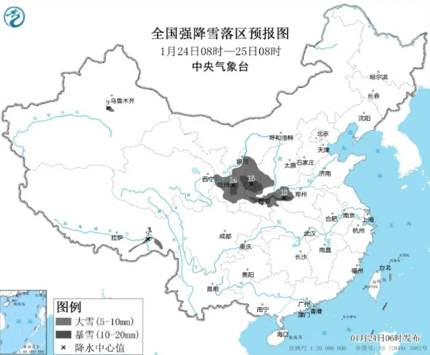 中央气象台24日发布暴雪黄色预警,预计1月24日14时至1月25日14时,甘肃东南部、宁夏、陕西中南部、山西西南部、河南西部、湖北西北部等地部分地区有大到暴雪,其中,陕西中南部、河南西部等地局地有大暴雪(20~22毫米)。上述部分地区新增积雪深度3~8厘米,局地可达10厘米以上。