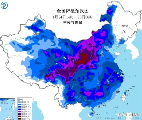 1月24日至27日,今年首场寒潮天气过程继续影响我国,中东部大部地区将陆续出现雨雪天气,西北地区东部、华北、东北等地局部有暴雪。北方多地累计降温幅度可达14℃以上,华北、黄淮部分地区最低气温或低于零下10℃。正值春运高峰期,公众请注意防寒保暖,雨雪天气出行需留意交通安全。