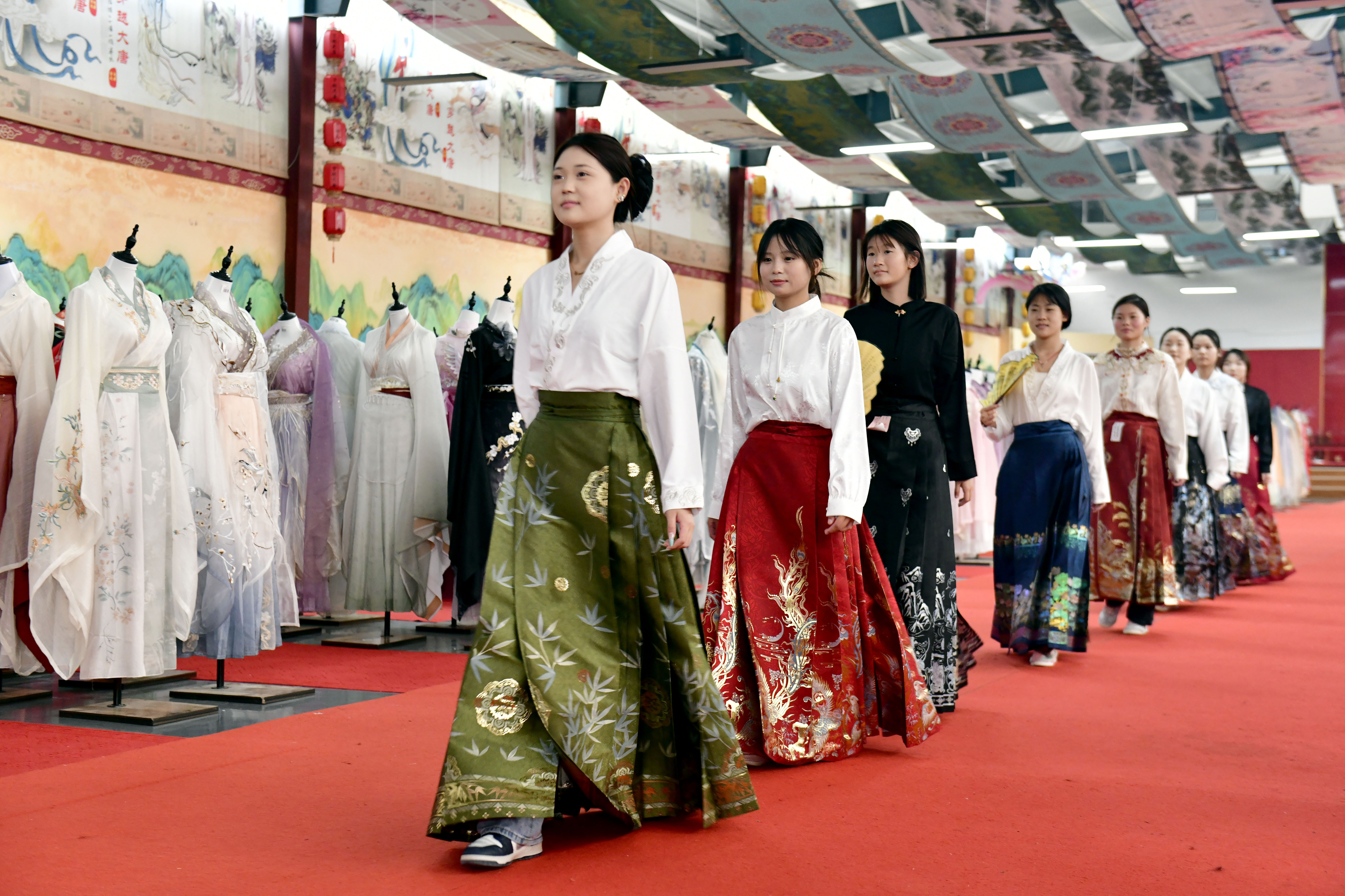 2024年9月27日,在山东曹县大集镇一家汉服基地,主播身穿汉服走秀。新华社记者 郭绪雷 摄