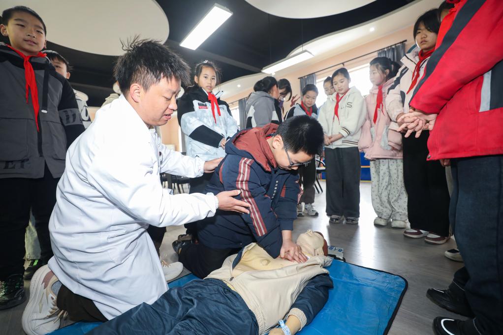 2月14日,东林镇卫生院医生在东林二小给学生普及应急救护知识。(新华社记者 徐昱 摄)