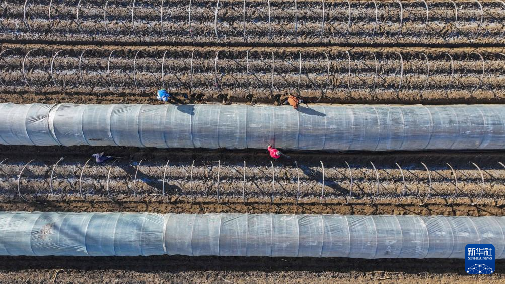 2月17日,农民在河北省遵化市一家蔬菜种植基地搭建暖棚,准备播种春季马铃薯(无人机照片)。