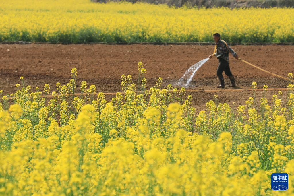 2月17日,在云南省腾冲市中和镇樊家营村,村民正在给新种植的荞麦浇水。