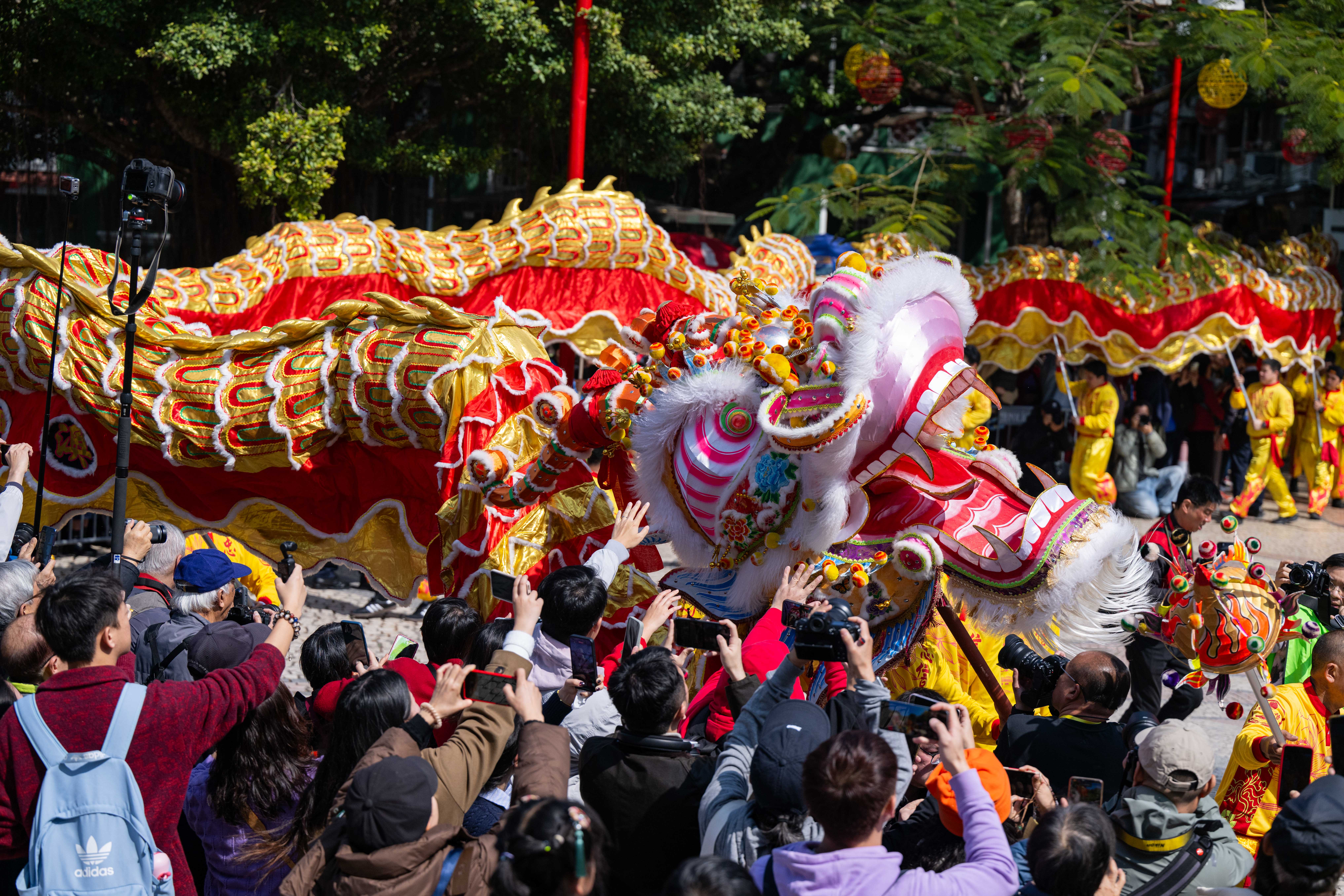 金龙启新岁,万事皆顺遂。“欢乐春节——2025年龙腾舞跃贺新春”社区巡演于29日上午11时在大三巴牌坊举行点睛仪式。238米长的大金龙及18头醒狮,联同“财神”“福、禄、寿三星”“金童玉女”及澳门旅游吉祥物“麦麦”向澳门居民和旅客拜年。