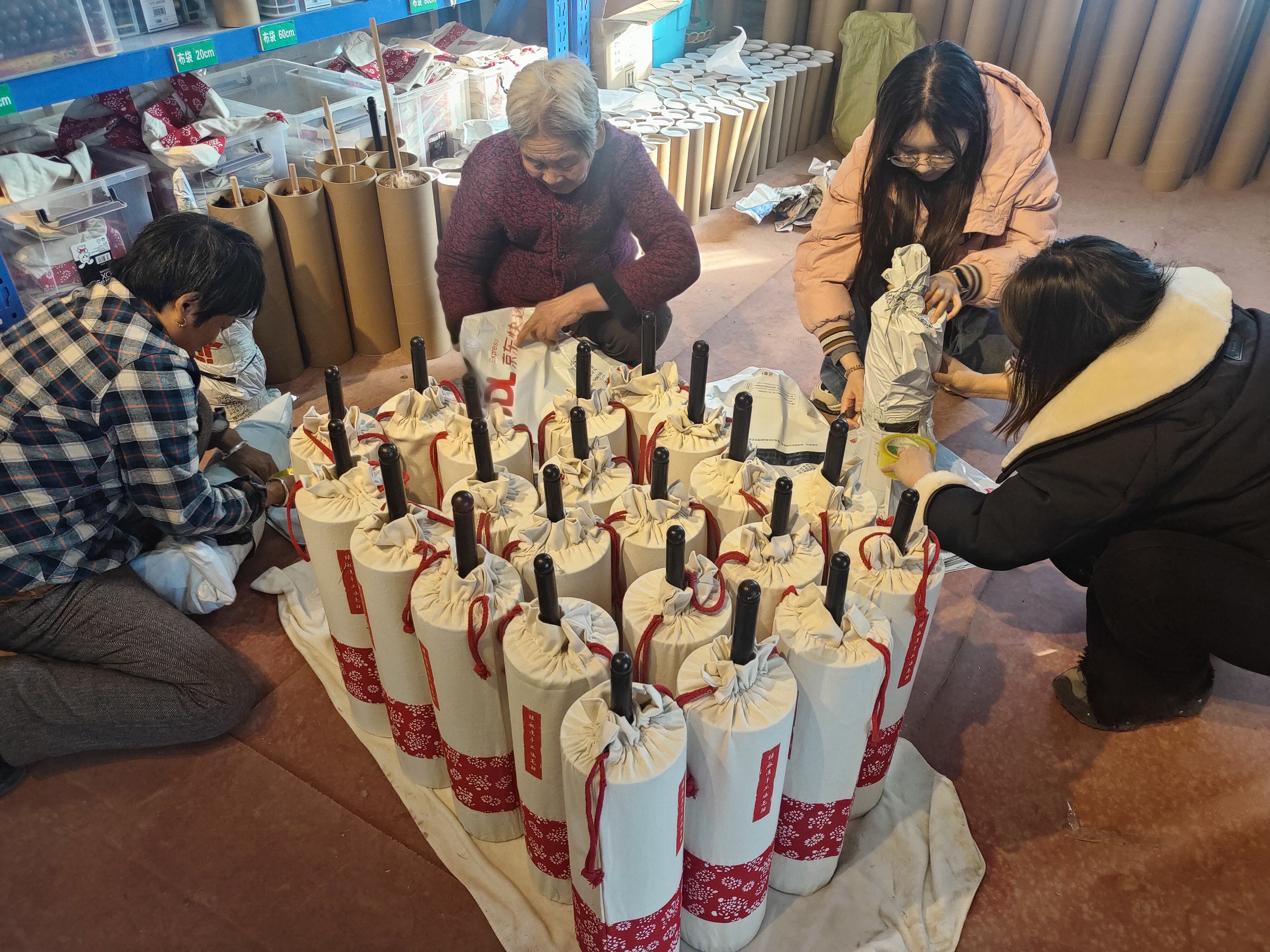 2月10日,村民们在打包已经下单的鸡毛掸子。(韩茂民 摄)