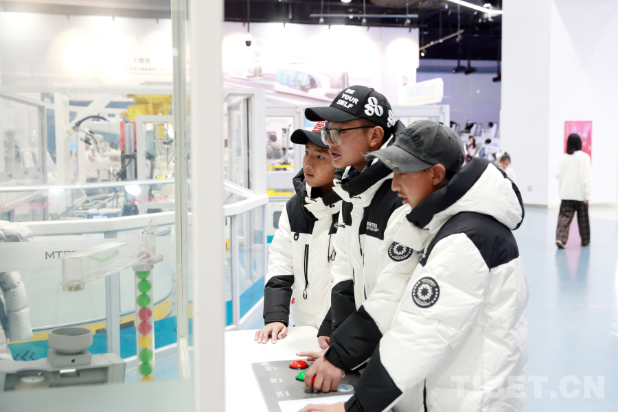 2025年2月12日,西藏自治区阿里地区边境县31名师生在京研学,图为3名同学在中国科学技术馆观察模拟实验 摄影:陈卫国