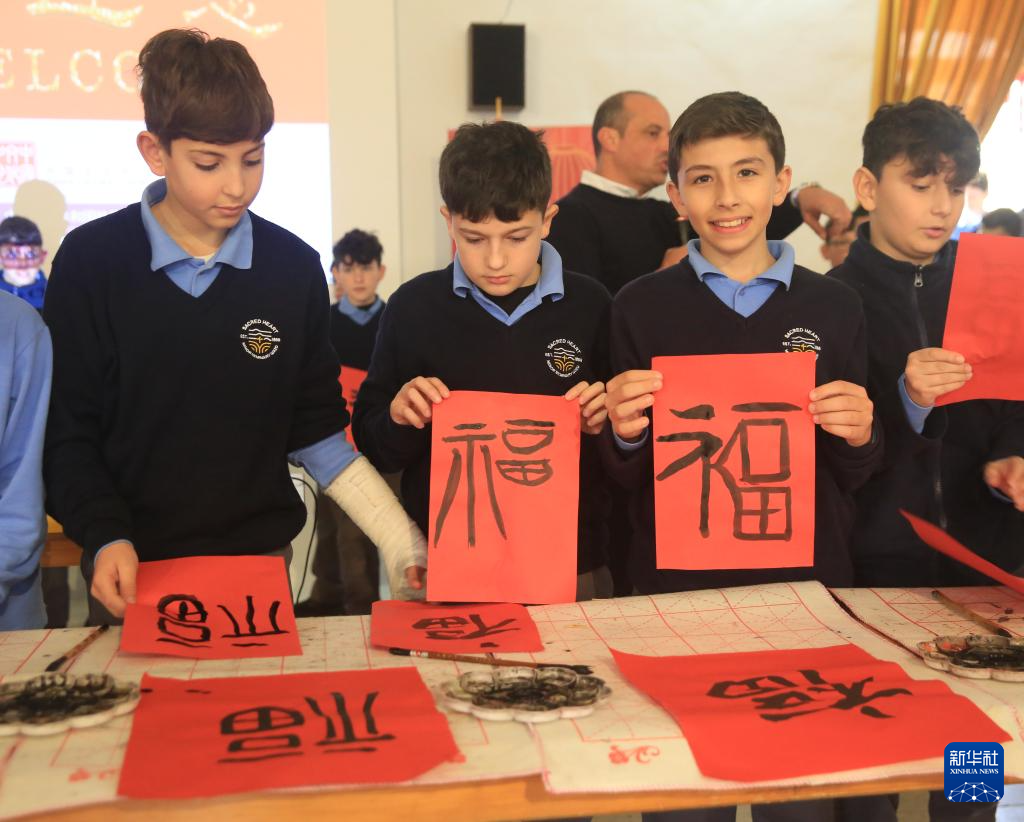与此同时,在学校礼堂内,学生们正在热火朝天地体验中国书法艺术的独特魅力。马耳他中国文化中心的工作人员为学生们讲解中国文房四宝的历史渊源,现场演示书法基本技法。随后,学生们兴致勃勃地练习书写,感受中国书法的韵味,他们在宣纸上留下的墨迹勾勒出对东方文化的向往。当一个个工整的“福”字、“春”字跃然纸上时,学生们兴奋不已,互相欣赏彼此的作品。