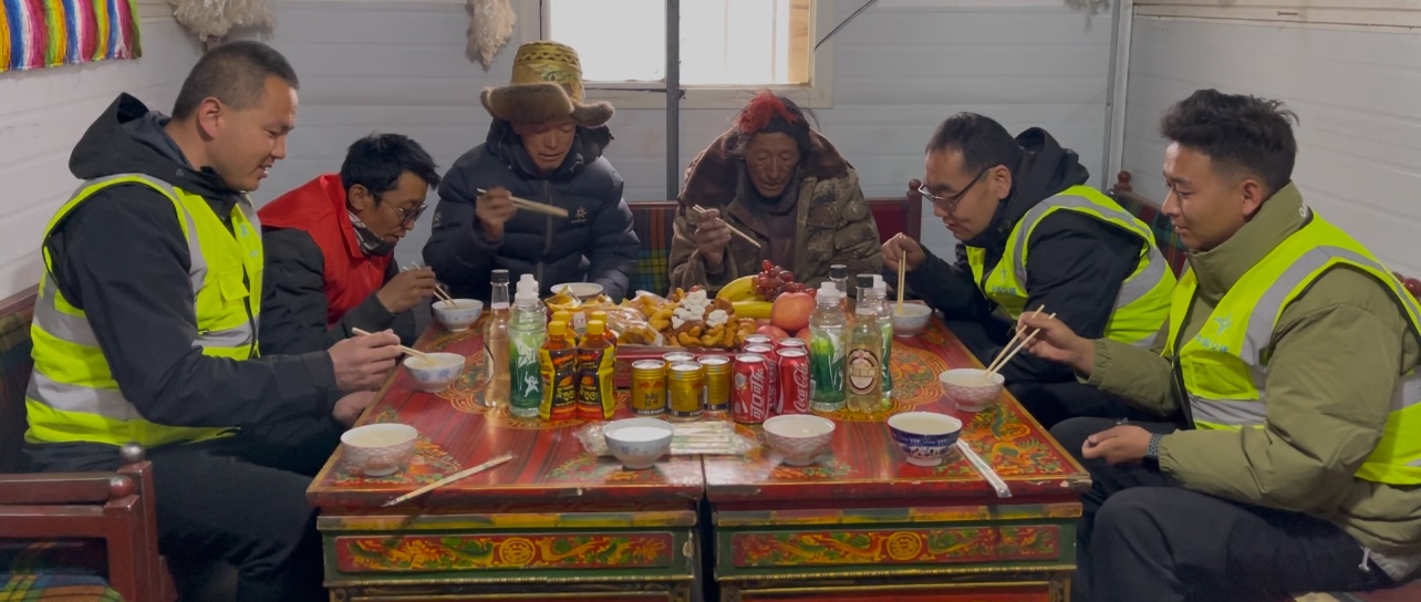 随着夜幕的落下,大家在暖和的板房里迎接藏历木蛇新年。
