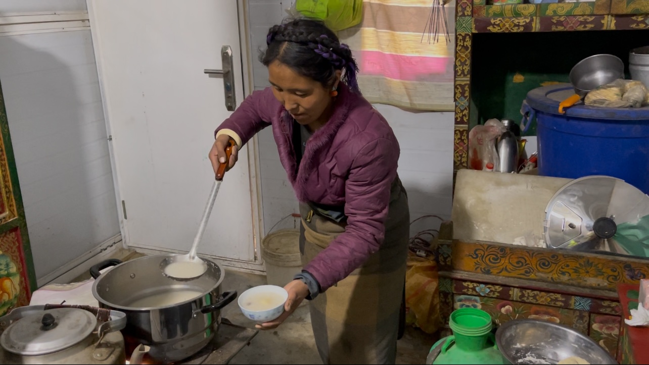 2月27日,藏历腊月二十九,是藏历新年的“古突”夜。根据西藏过年习俗,这一晚家家户户都会做“古突”。阿旺次仁家的“古突”是一种藏式面粥,粥里有牛肉、羊肉、人参果等九种食材。每份“古突”里有一个面团,里面包着羊毛、辣椒、盐巴等有不同寓意的物品,增加过年的乐趣。