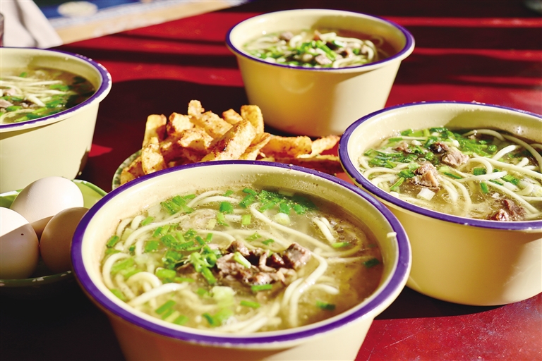 在西藏,人们总能将简单的食材做出独一无二的“西藏味道”。一壶甜茶,一碗藏面,一份炸土豆或肉饼,便是这里最标准的早餐套餐。清水、红茶茶叶、甜奶粉或牦牛奶,只需简单的食材,便能制作出茶香浓郁、奶味醇厚的甜茶。在略带寒意的初春,喝上一口,整个身子都暖了起来。此时搭配一碗筋道的藏面,简单又满足。