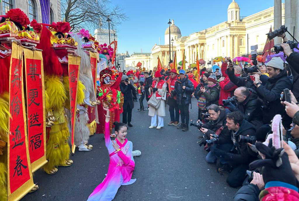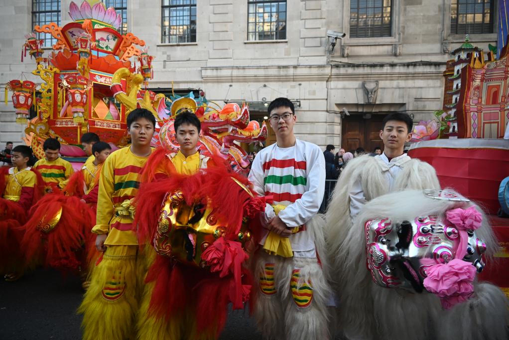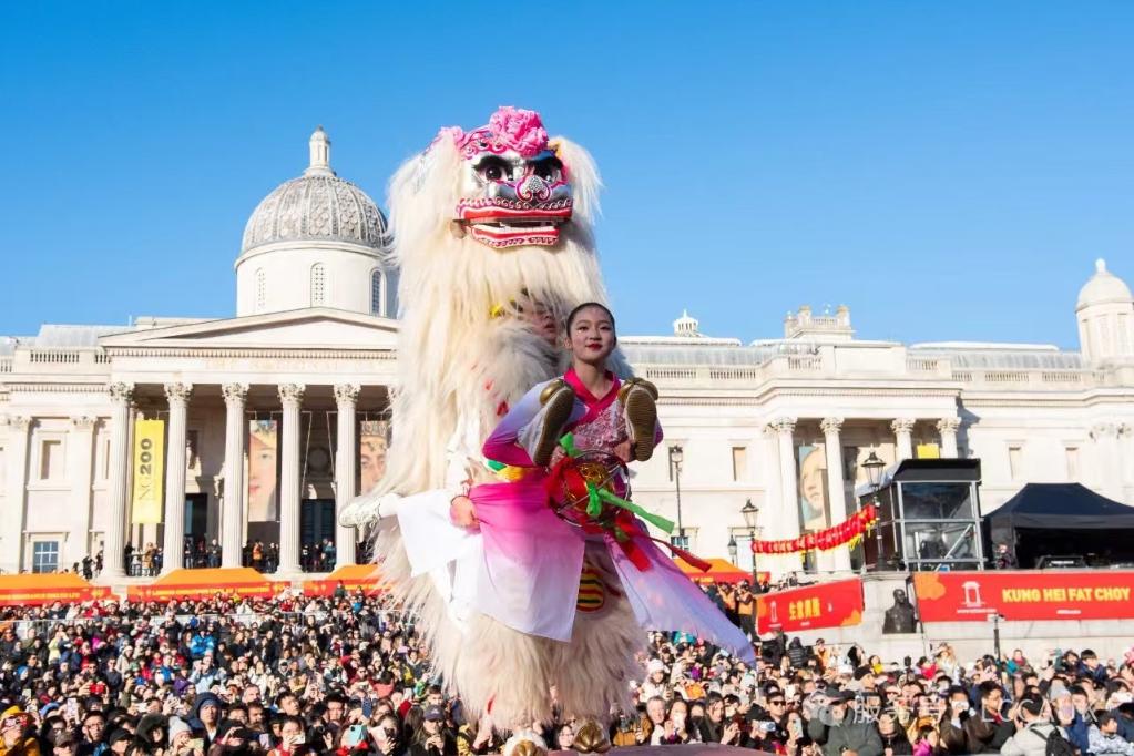 图为在伦敦举行的2025年“四海同春”新春文化庆典活动上,朱浩然等队员们表演“引狮员高台钳腰狮身旋转1080度”动作。