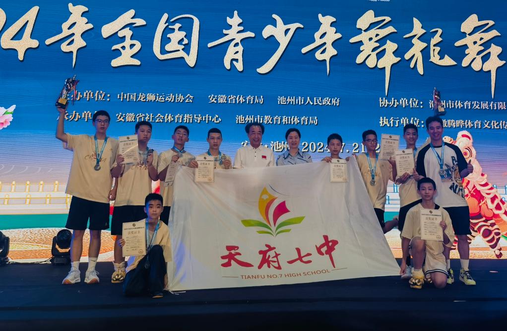 图为天府第七中学北狮队在2024年全国青少年舞龙舞狮锦标赛上获得创意龙狮冠军
