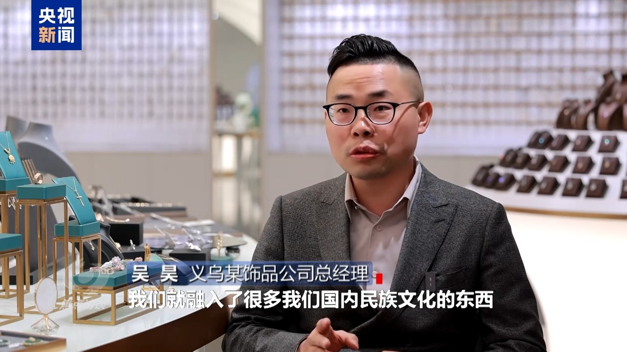 义乌某饰品公司总经理 吴昊:在这一块,融入了很多我们国内民族文化的东西,重新组合去创造,他们都会喜欢这个东西。其实归根结底,还是我们通过这么多年的发展,我们国家人民的日子越过越好的时候,这个民族文化的自信是从国人的骨子里面迸发出一种自信的体现。