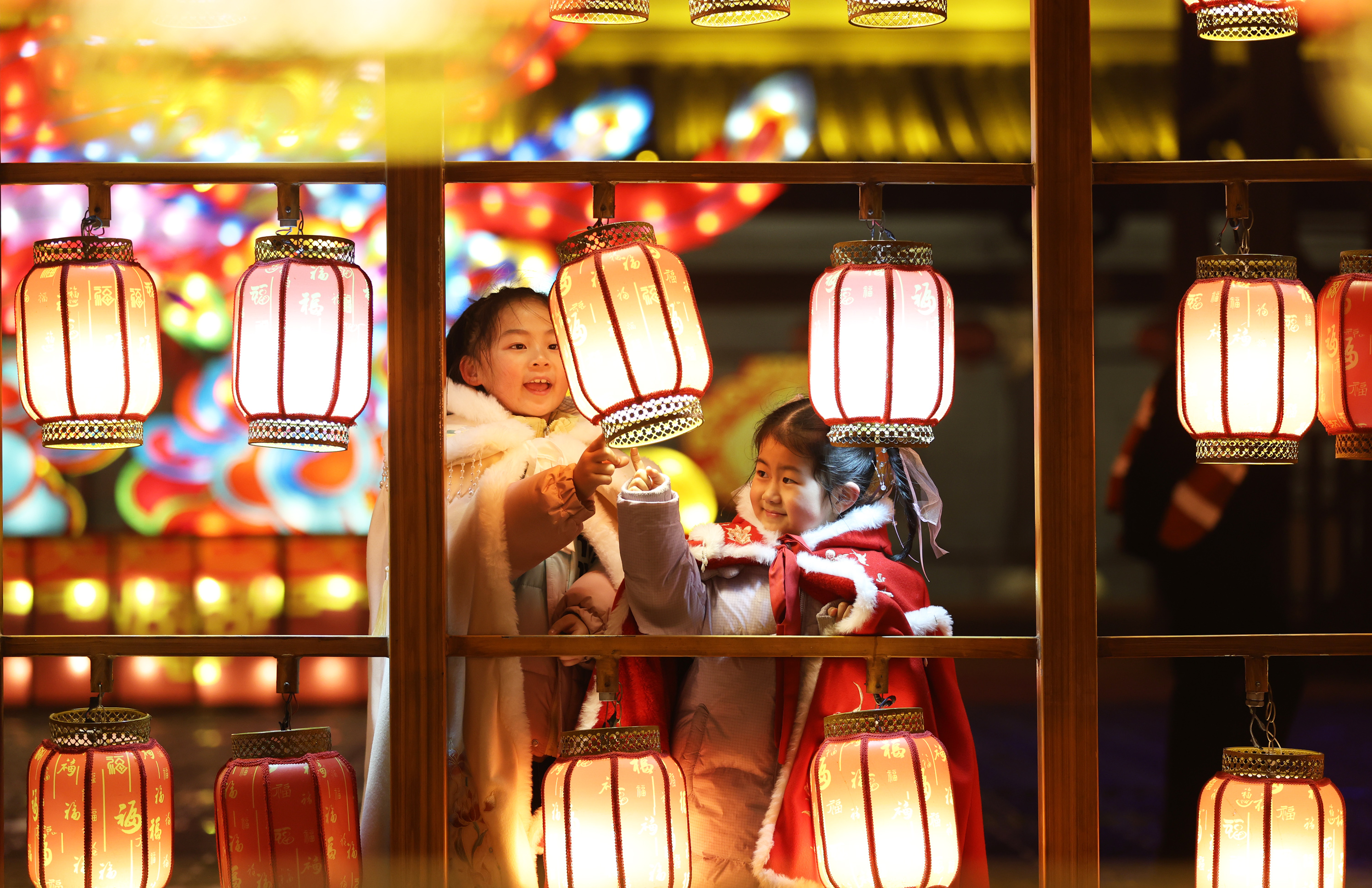 2025年1月31日晚,在山东省临沂市郯城县郯国古城景区,两名穿着传统服饰的小女孩在观赏花灯。 新华社发(张春雷 摄)
