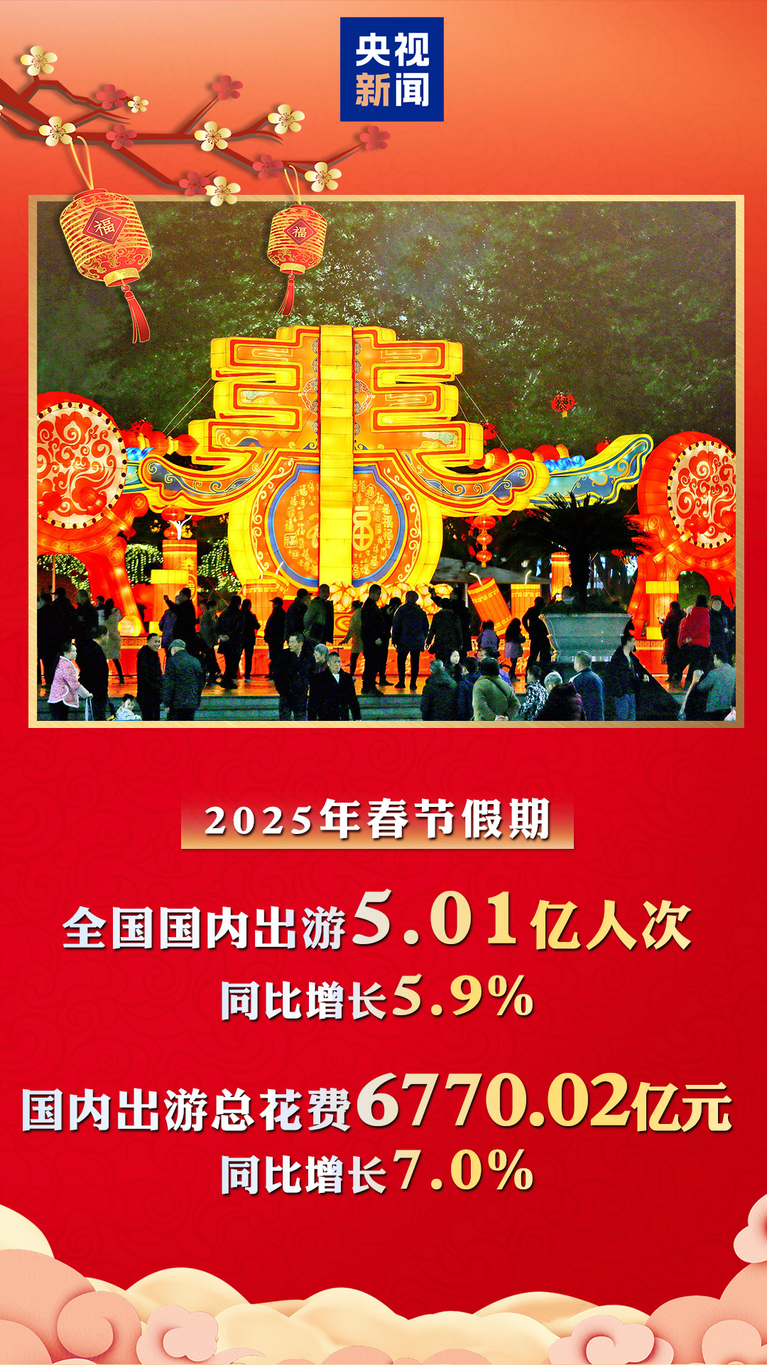 经文化和旅游部数据中心测算,春节假期8天,全国国内出游5.01亿人次,同比增长5.9%;国内出游总花费6770.02亿元,同比增长7.0%。