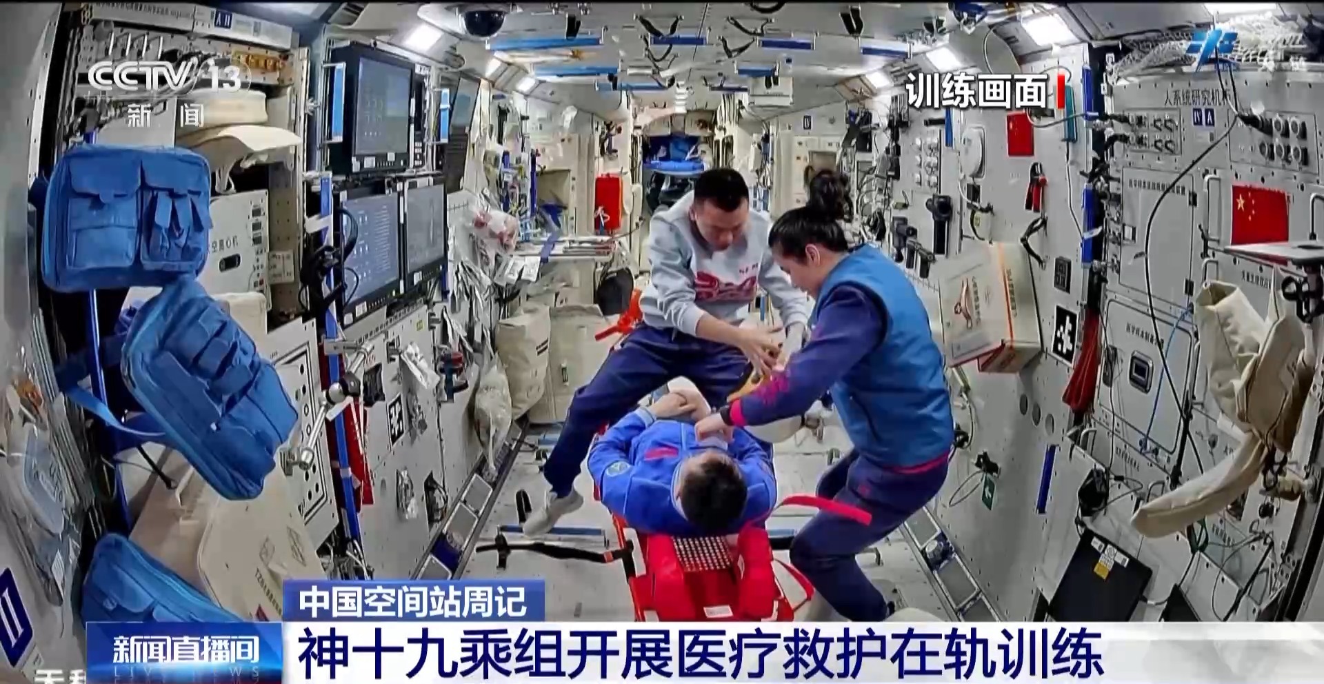 乘组按计划开展了医疗救护在轨训练,进一步熟悉设备位置、复习使用方法、巩固操作流程和技能,并通过训练感受天地差异,熟悉微重力环境下的救护操作方式、施力特性等。