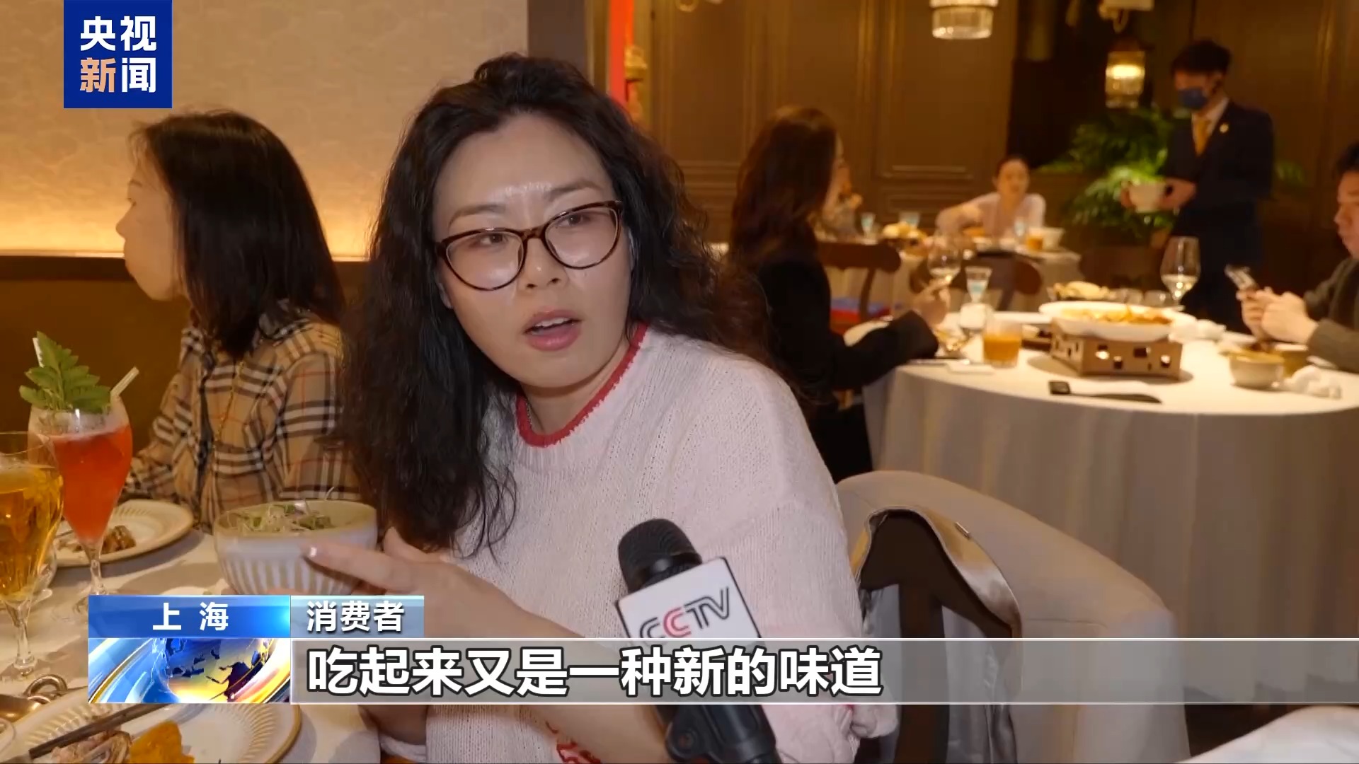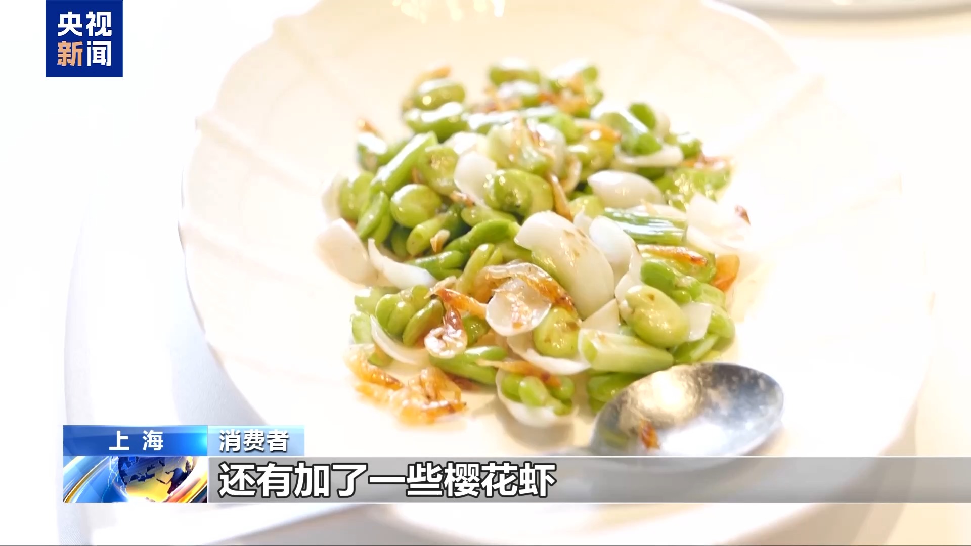 消费者:来到这边,感受一下春天的时令菜。这里的蚕豆有特色,因为混合了百合,加了一些樱花虾,有南北融合的感觉。