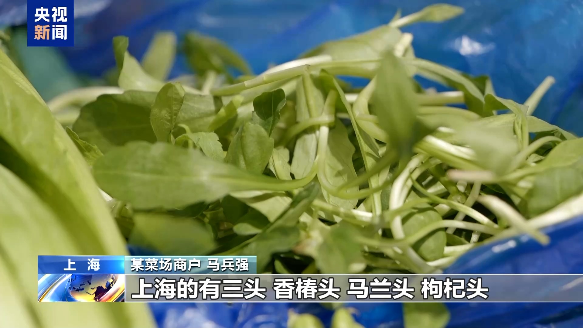 某菜场商户 马兵强:上海有三头,香椿头、马兰头、枸杞头。现在陆续米苋,空心菜大量上市了,这两个菜卖得也蛮好的。