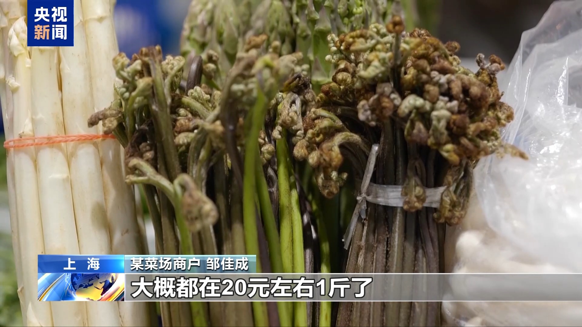 某菜场商户 邹佳成:这种藠头因为量少,价格大概要到15元左右1斤。像这种新鲜的蕨菜价格也还是不便宜,大概20元左右1斤。比刚开始价格已经有一点回落了,随着后面的供应量越来越大,价格基本会降。
