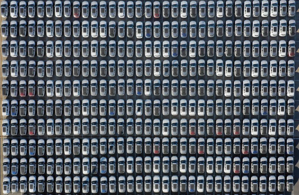 2025年2月25日,等待装船的车辆停靠在天津港环球滚装码头(无人机照片)。新华社记者 赵子硕 摄