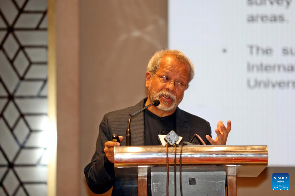 Imtiaz Ahmed, executive director at the Center for Alternatives, introduces the survey "National Image of China in Bangladesh," in Dhaka, Bangladesh, March 11, 2025. Around 90 percent of Bangladeshi respondents have favorable stance on China and their satisfaction is increasing over the past three years, according to a leading local think-tank survey. The survey, "National Image of China in Bangladesh," released on Tuesday, found that the overall image of China in Bangladesh has improved and shows consistent trends in several areas, including Bangladesh-China economic relations, people's perception of the Chinese society and economic situation. (Photo by Habibur Rahman/Xinhua)