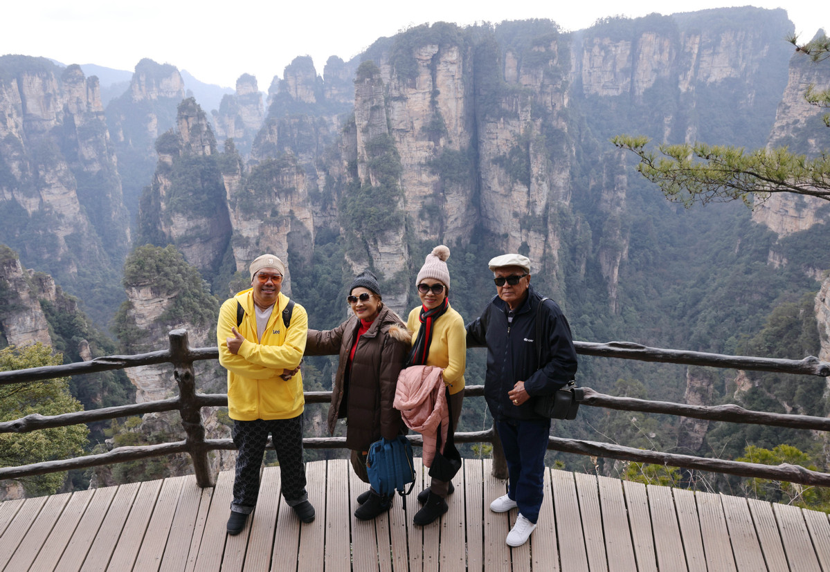 2月15日,泰国游客在张家界国家森林公园袁家界景区游玩。(图片来源:新华社)