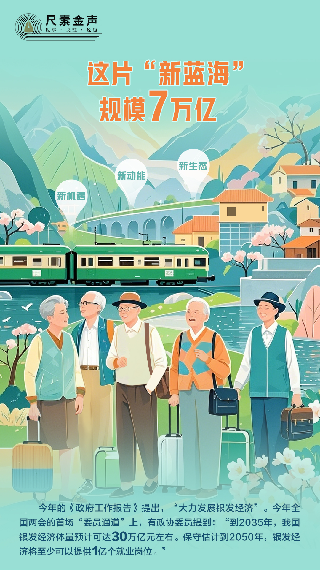 今年的《政府工作报告》提出,“大力发展银发经济”。今年全国两会的首场“委员通道”上,有政协委员提到:“到2035年,我国银发经济体量预计可达30万亿元左右。保守估计到2050年,银发经济将至少可以提供1亿个就业岗位。”