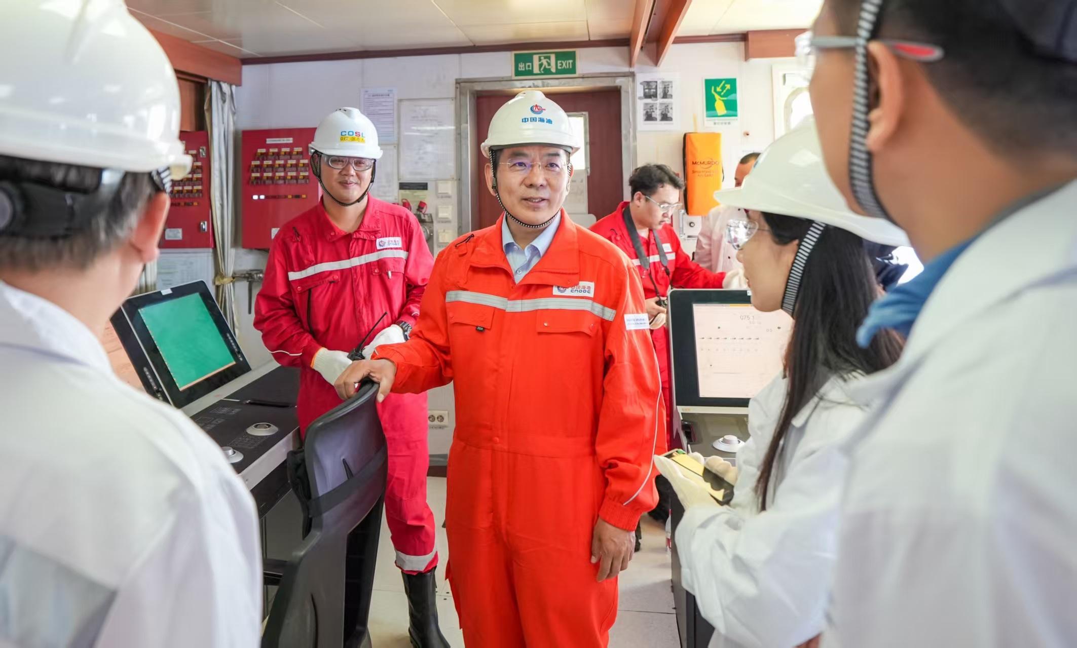 中国海油研究总院总工程师、钻完井专家李中与工作人员在作业现场交流沟通。