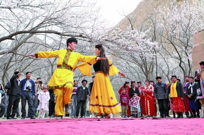 新疆阿克陶县塔尔乡民间艺人与游客在杏花树下共舞。毛吾拉江·艾山江摄