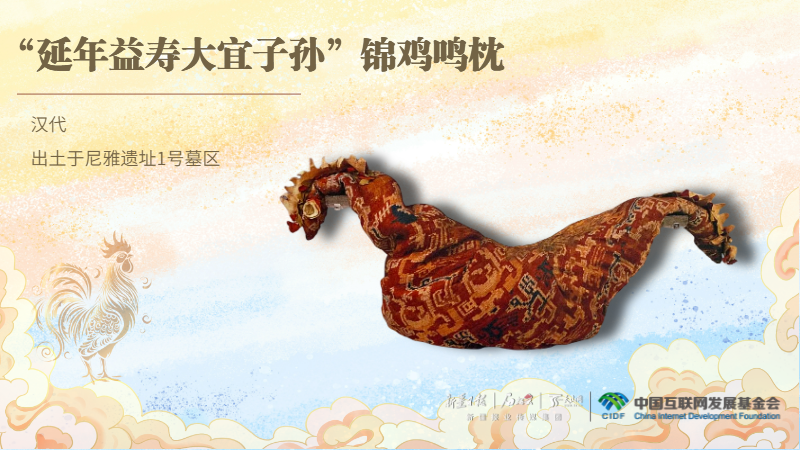 这件馆藏于新疆博物馆的文物出土于尼雅遗址的东汉墓葬。长50厘米,宽13.5厘米,高9厘米,由一块“延年益寿大宜子孙”文字锦缝缀而成,中间是鸡身,两端作鸡首相背状,白绢为底、叠放三层圆形红绢片缝制出了圆眼,天青和白两种绢剪出锯齿形的鸡冠。枕芯是植物茎秆。