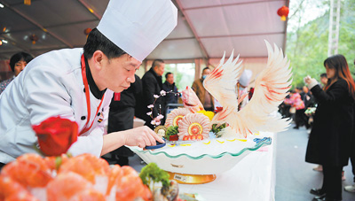 在四川南充举办的火锅美食文化活动上,火锅企业的大厨为观众呈现出一道道美食菜肴。
