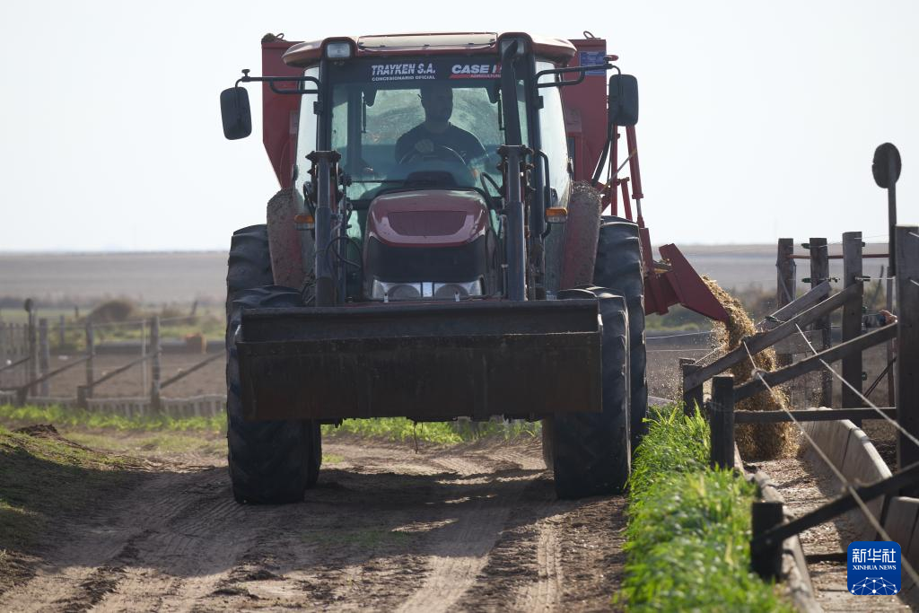 5月14日,工作人员在阿根廷潘帕斯草原莱因迪亚纳牧场驾驶喂食机投食。新华社记者 孟鼎博 摄