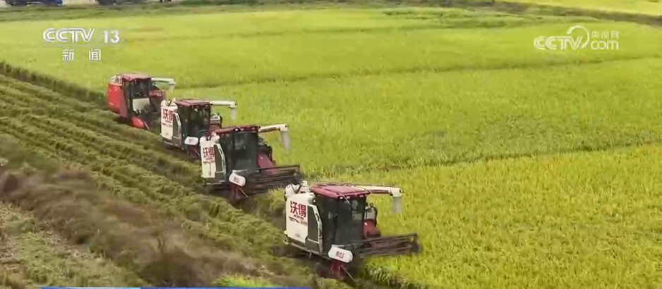 在江西吉安吉水县水田乡的一处高标准农田,现在正值晚稻集中收割的关键时期。在记者身后,几台收割机正穿梭在稻浪之中。伴随着机械轰鸣声,切割、脱粒、粉碎秸秆等工序一气呵成。金黄的稻谷顺着输粮管道进入运输车,随后被送往烘干厂。机械化的收割效率很高,一台每天能够收割五六十亩,连片的几百亩稻田几台收割机一天就能收完。