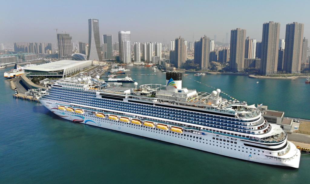“爱达·魔都号”邮轮靠泊在青岛邮轮母港码头(无人机照片)。新华社记者 李紫恒 摄