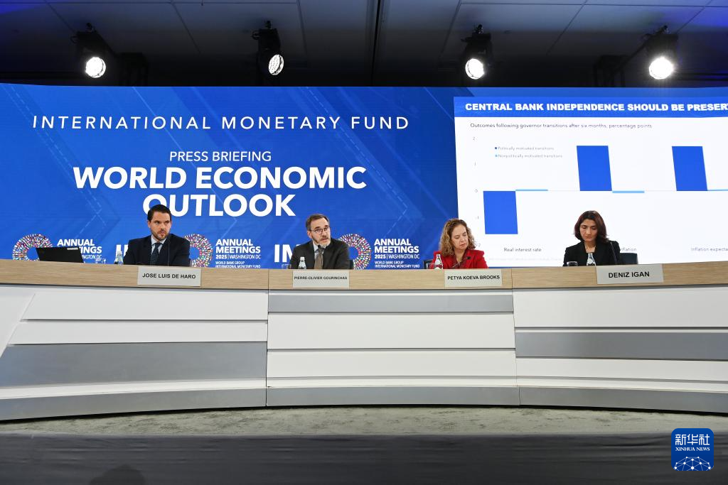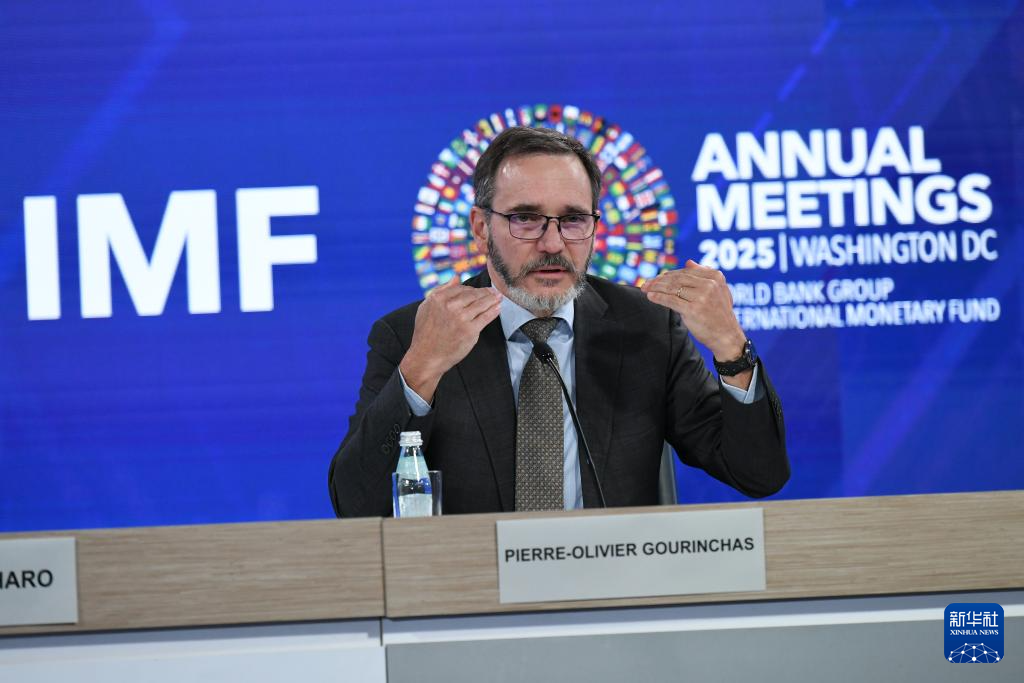 10月14日,在美国华盛顿,国际货币基金组织首席经济学家皮埃尔-奥利维耶·古兰沙(中)在《世界经济展望报告》新闻发布会上讲话。新华社记者 李睿 摄
