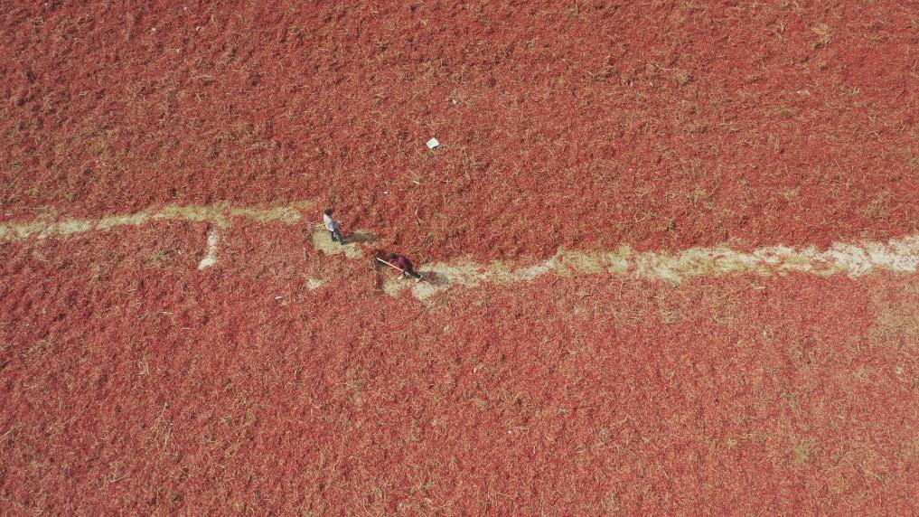 在距离沙湾市数百公里外的焉耆县,14万亩辣椒进入了采收晾晒的关键期。戈壁晒场被火红的辣椒铺满,远远望去,宛如给大地铺上了一层红色的地毯。农民沙尼亚·艾海提今年种植了600亩辣椒,眼下正是她最忙碌的时候。