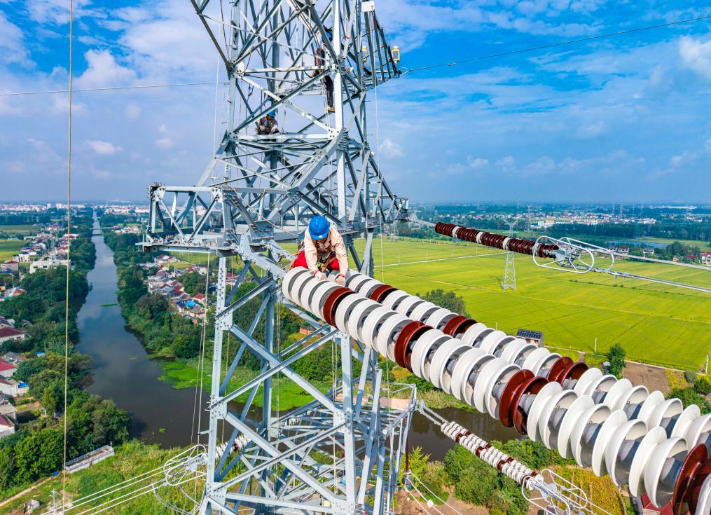10月1日,电力人员在扬州-镇江±200千伏直流输电二期工程施工现场作业(无人机照片)。新华社发(任飞摄)
