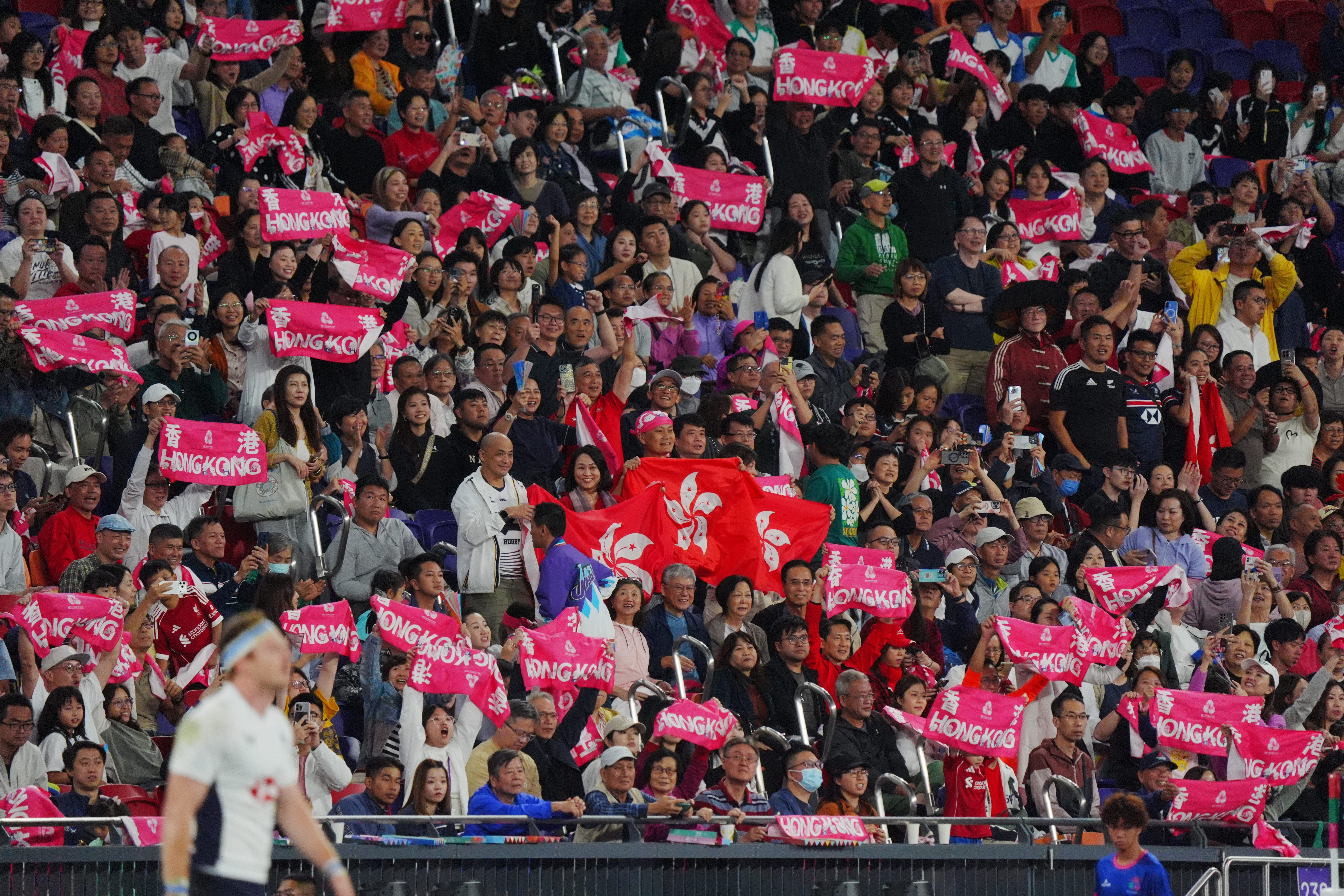 香港市民叶先生特意购票来到启德观看14日晚间的七人制橄榄球比赛,为闯入决赛的香港男队加油。“这次的橄榄球比赛在香港举办,我当然要来看!”他的语气中难掩激动,“在主场看到他们夺冠真的太开心了!”