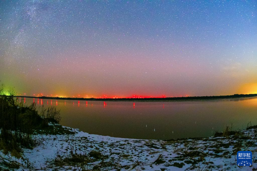 这是11月12日在黑龙江省齐齐哈尔市嫩江江畔拍摄的绚丽极光(堆栈合成照片)。
