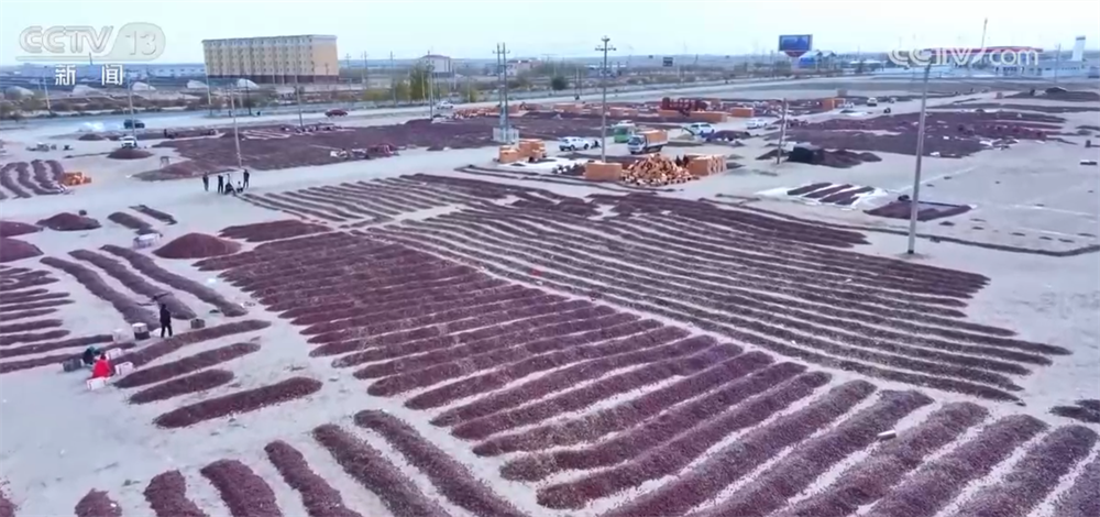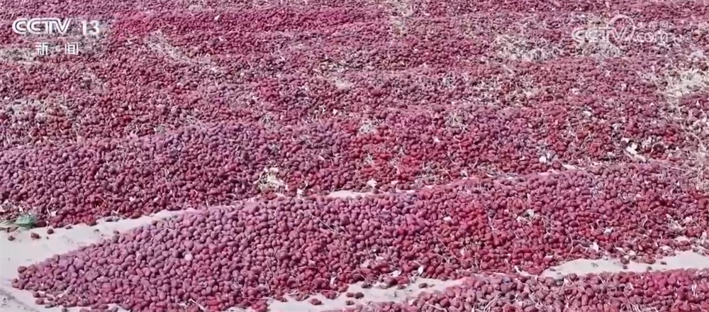 随着红枣采摘进入高峰期,在策勒县的戈壁晾晒场,放眼望去,红彤彤的红枣铺陈开去。今年,策勒县红枣种植面积达15万亩,产量超过3.6万吨。这些红枣大部分已被预订,主要销往北京、上海、广州等地;火红的晾晒场吸引了众多自驾游游客慕名而来,游客们走进晾晒场分拣、品尝红枣,沉浸式感受丰收的甜蜜与戈壁秋景的壮阔。