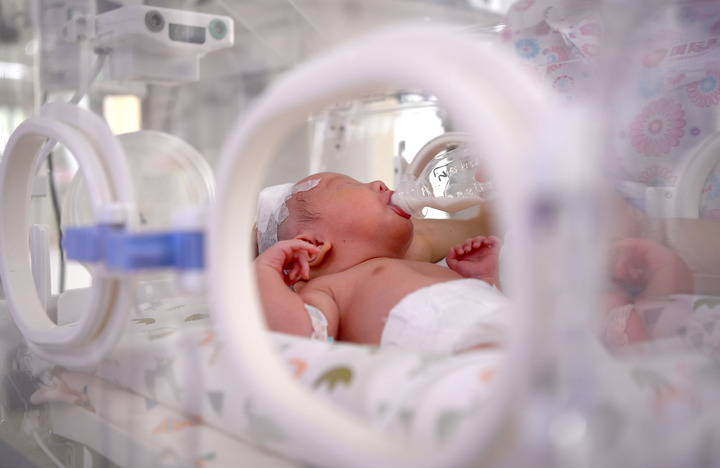 2024年6月1日,在西安国际医学中心医院新生儿科病房,护士为新生儿喂奶。新华社记者 刘潇 摄