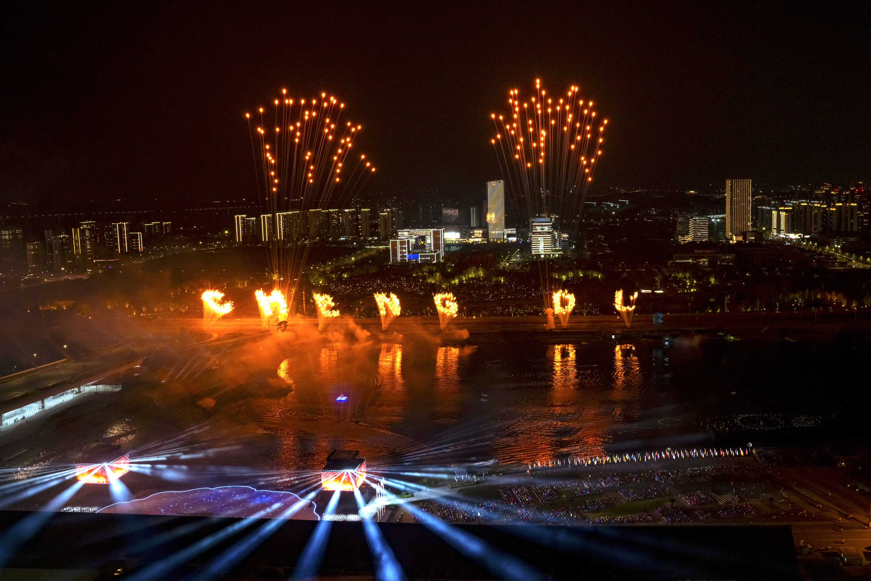 2025年8月7日在成都拍摄的第12届世界运动会开幕式上的焰火表演。焰火中的“成都”来自青铜器上的篆书铭文。通过现代科技的烟火表演,将古蜀文明展示给全世界观众。