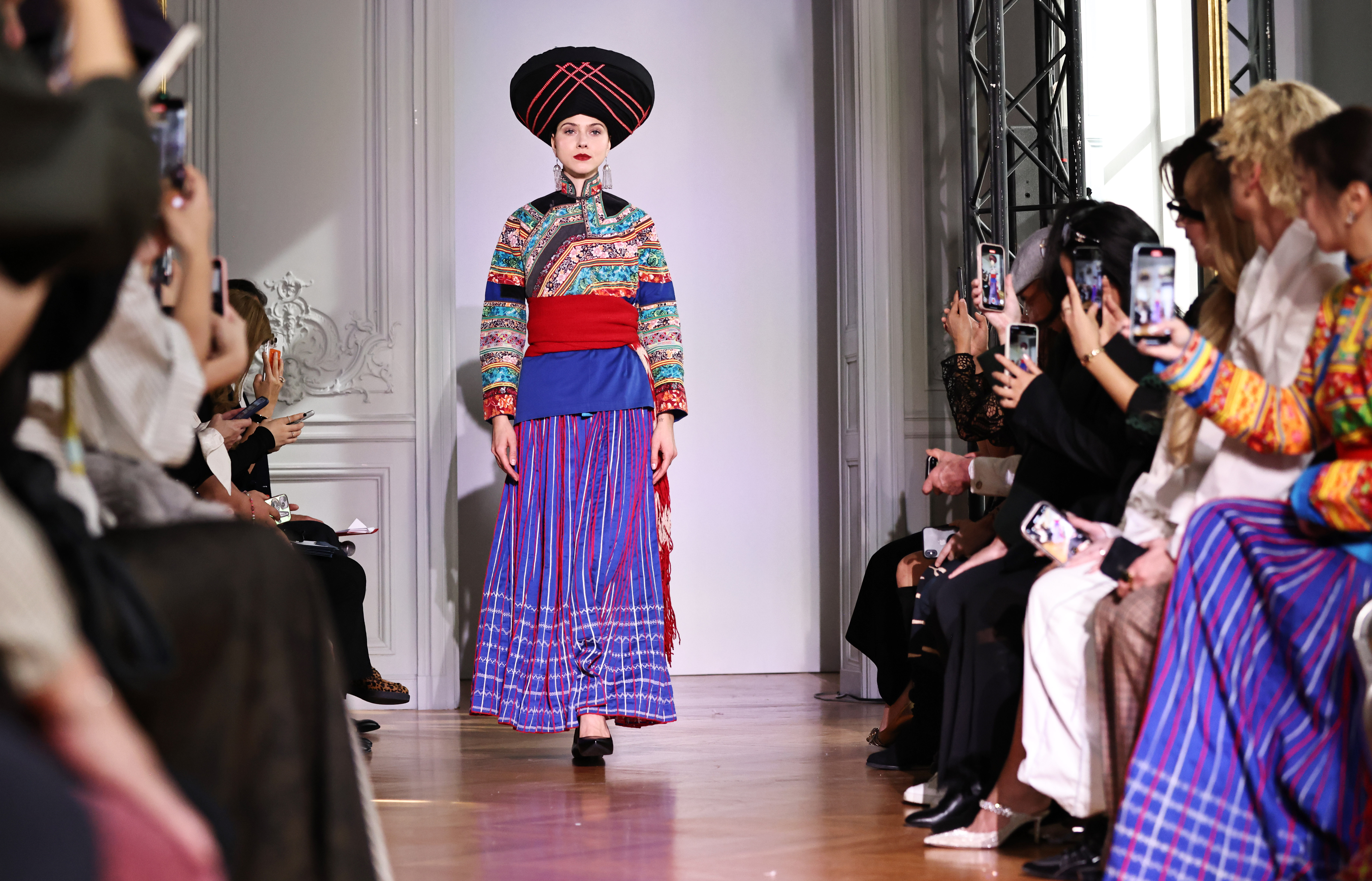 2025年10月1日,在法国巴黎中国文化中心举行的第三届中法时装周上,模特在“非遗四川·百城百艺”盐边·傈僳族服饰时尚秀上展示服装。